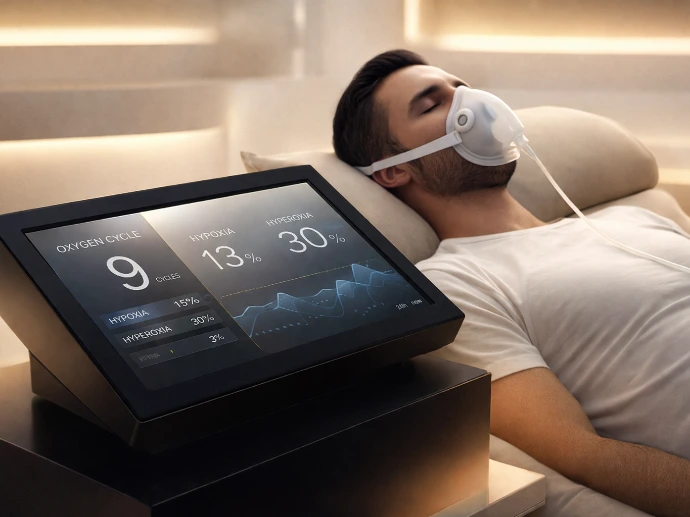 Applied within advanced performance and longevity protocols. IHHT exposes your body to carefully controlled variations in oxygen levels, alternating between lower and higher concentrations. This trains your cells to become more efficient in how they use oxygen, stimulating mitochondrial renewal and helping eliminate weaker cells, while promoting stronger, more efficient ones.